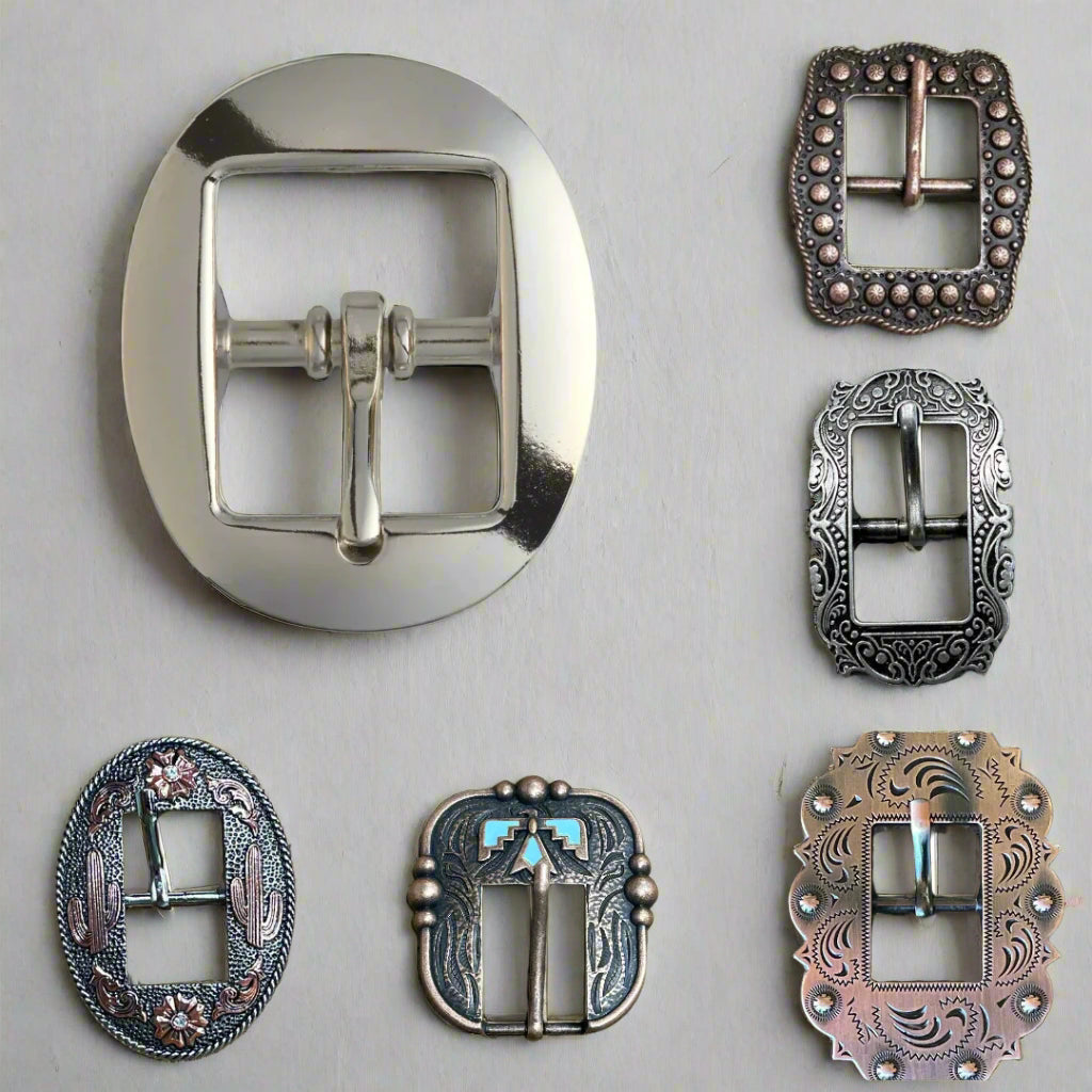 We keep silver hardware and silver cart buckles (top left) in stock at all times. However, we can special order different buckles and different colored hardware. Shown are just a few samples of buckles we can special order.