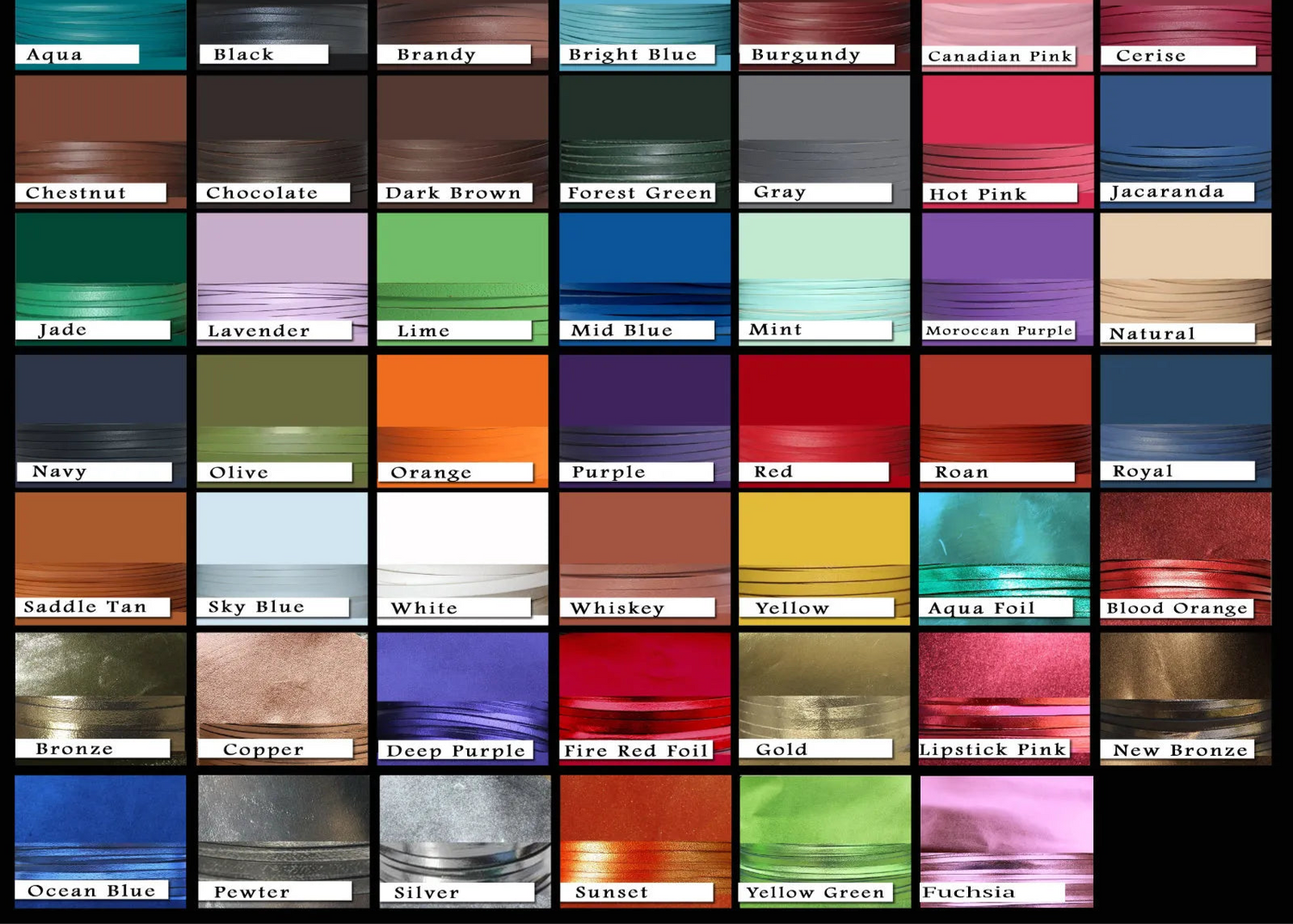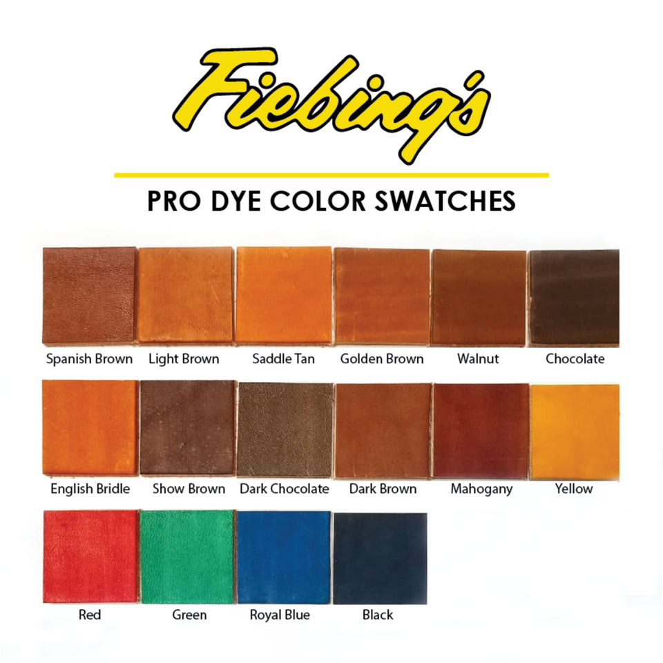JK Custom Tack uses Fiebings Pro Dye to hand dye all of our products. The colors we keep in stock are as follows: Black, Mahogany, Dark Brown, Spanish Brown, and Chocolate. Keep in mind we can special order any of the colors shown it just might add to the processing time.