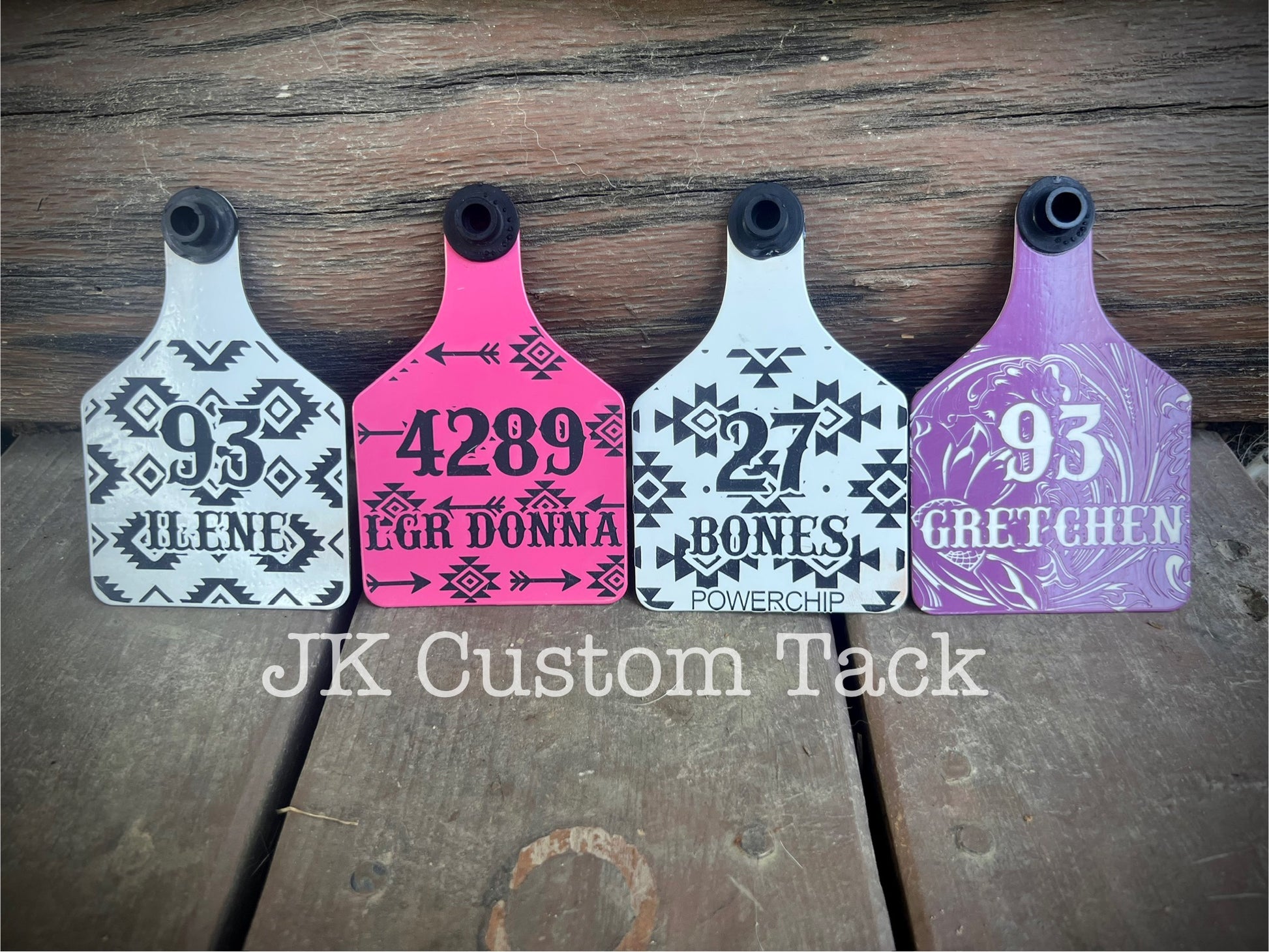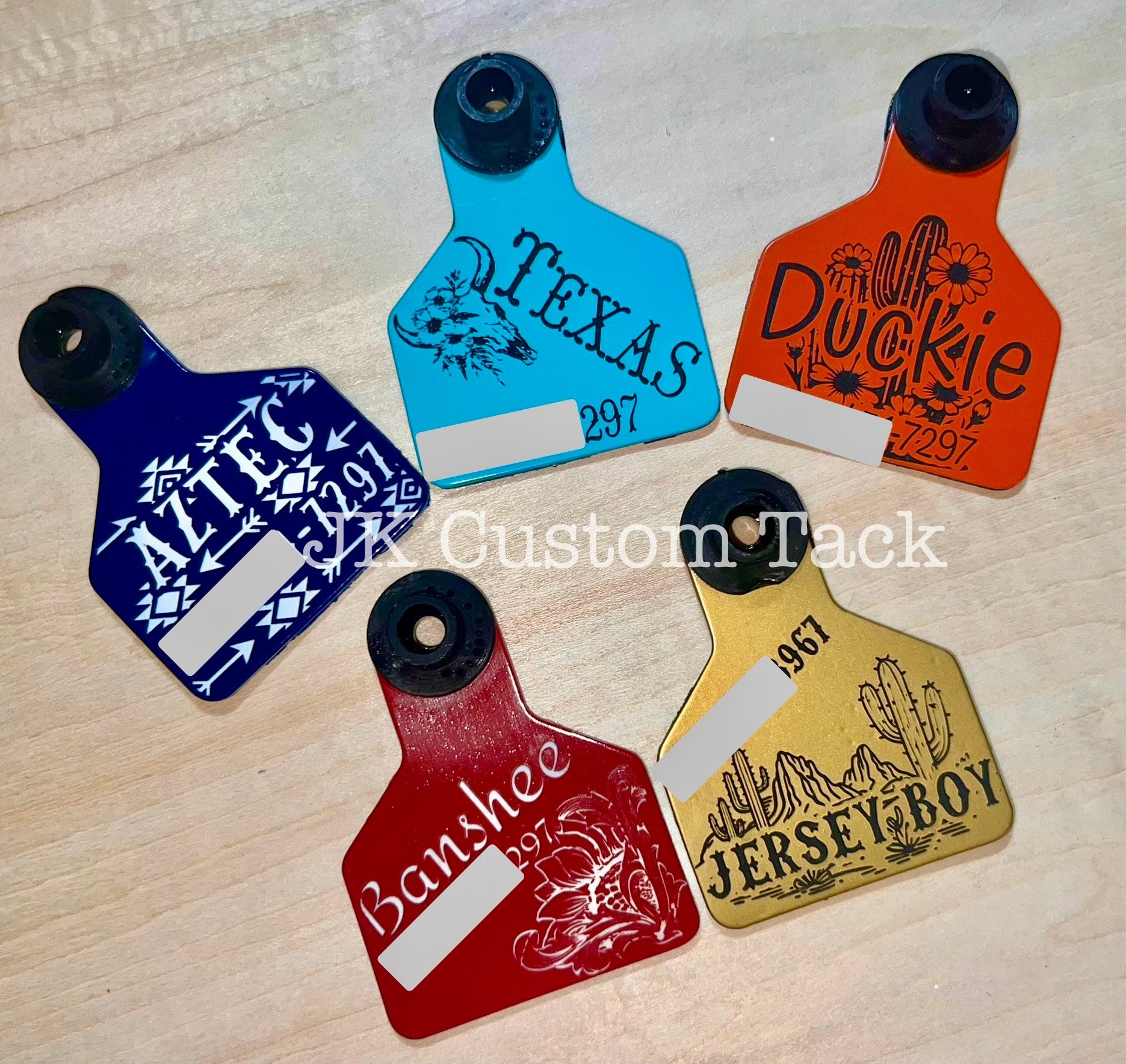 Custom engraved livestock ear tags for cattle/sheep/goats/pigs or even for a keychain. These are permanently engraved no fading or rubbing off! You can have either one or both sides engraved with id numbers, personal brands, names, designs, and more!