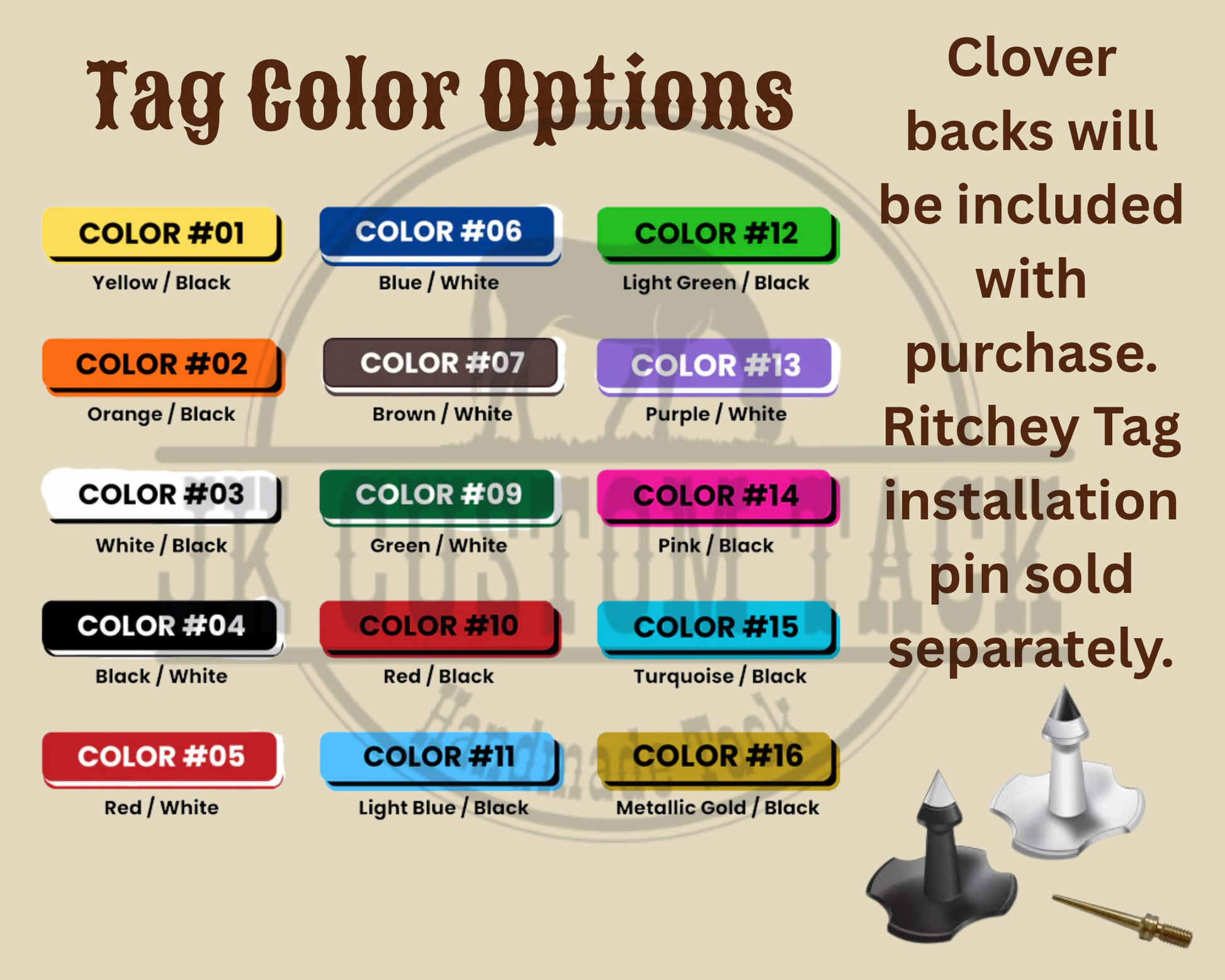 **It's recommended to use the Ritchey Tag Pin for installing these tags with the Ritchey clover back button that I will provide with them. The tag pin can be purchased as an add-on to your order. We charge what they cost us to buy them, no added fees. It adapts to most universal taggers.