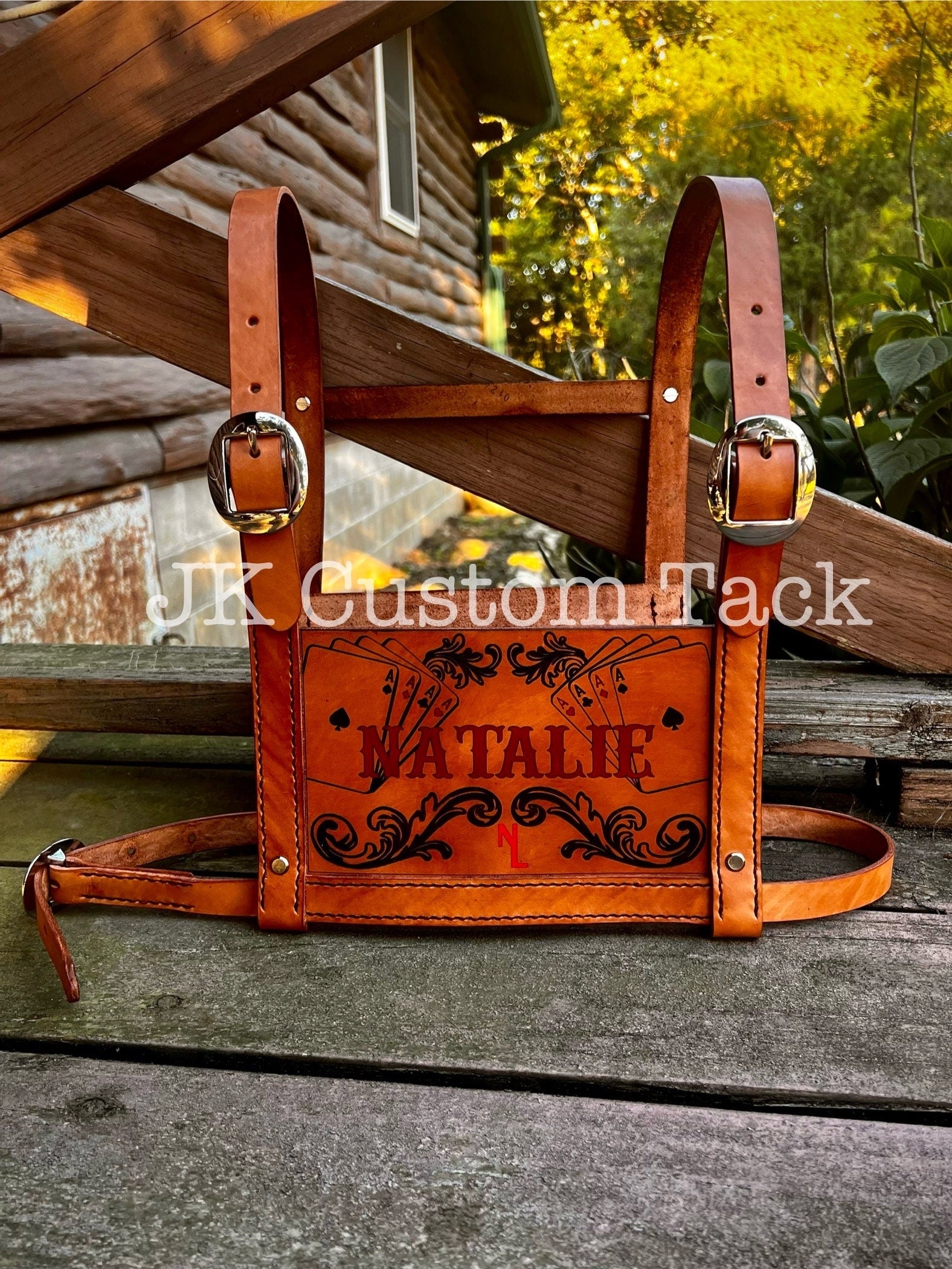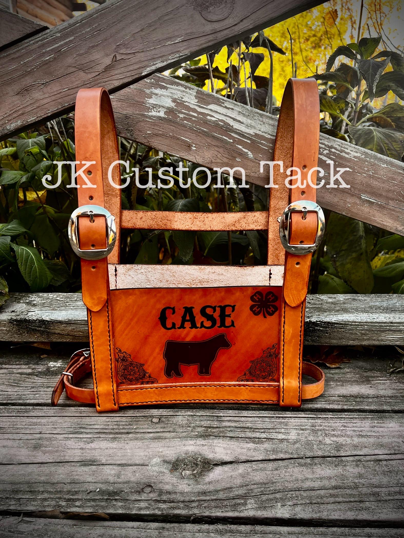 Custom handcrafted livestock show harness! Made with genuine leather and details can be hand painted. The front is fully customizable! Message me to come up with your unique design. We can do names, farm brands, animals, you name it. Be sure to include in the description your measurement around the bottom of your rib cage for the bottom belt portion! *The sizes just change the shoulder strap lengths.