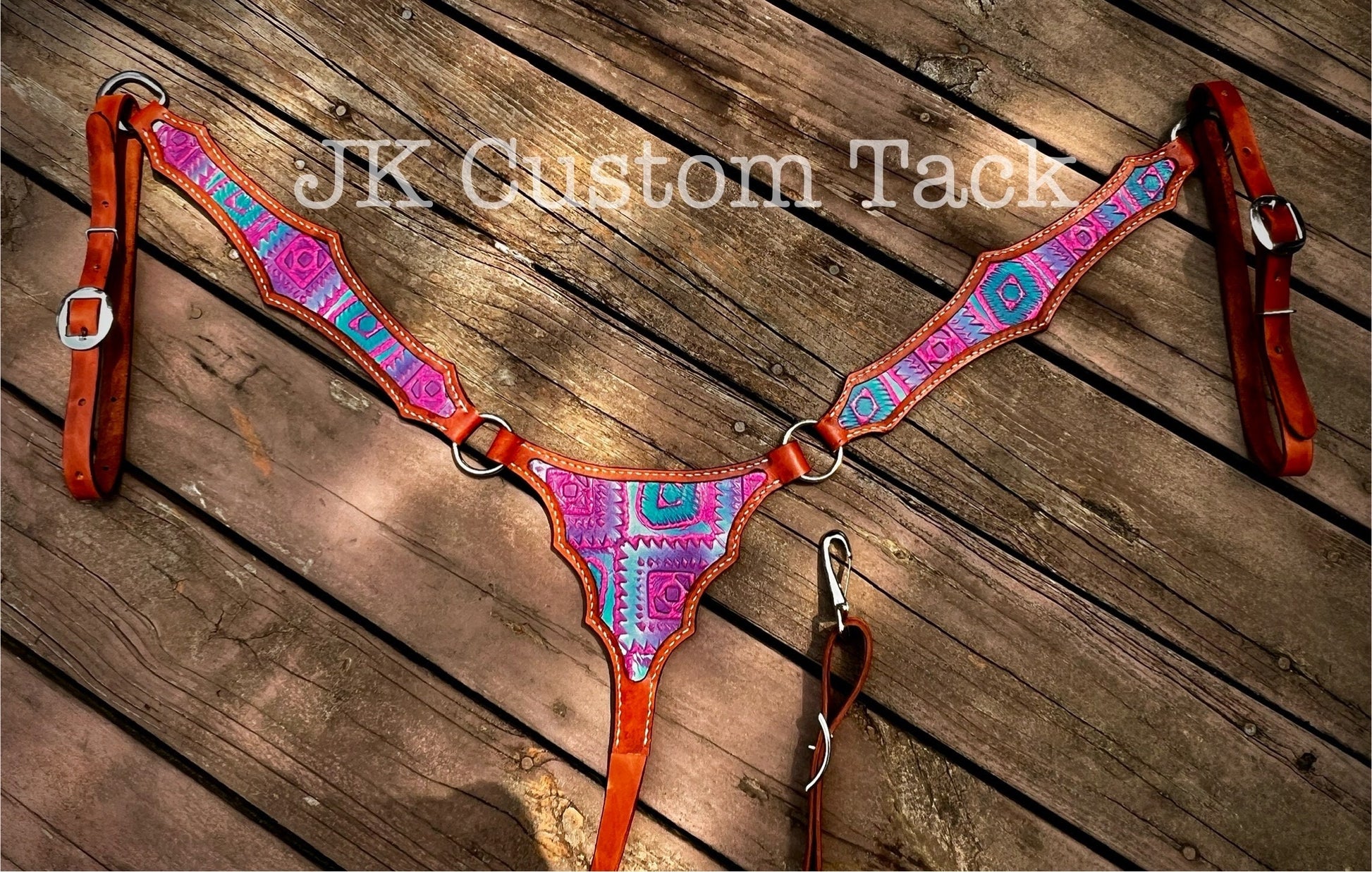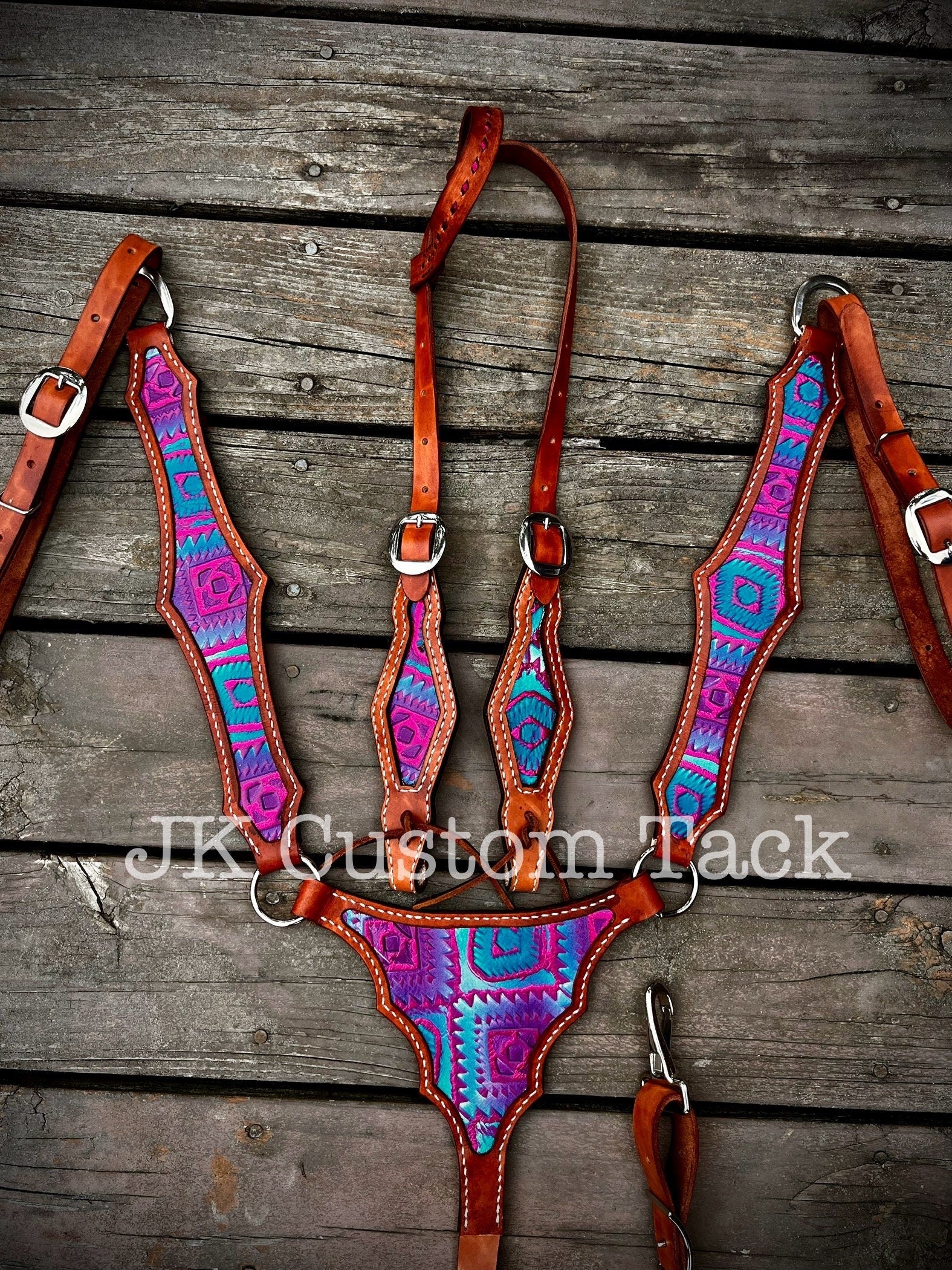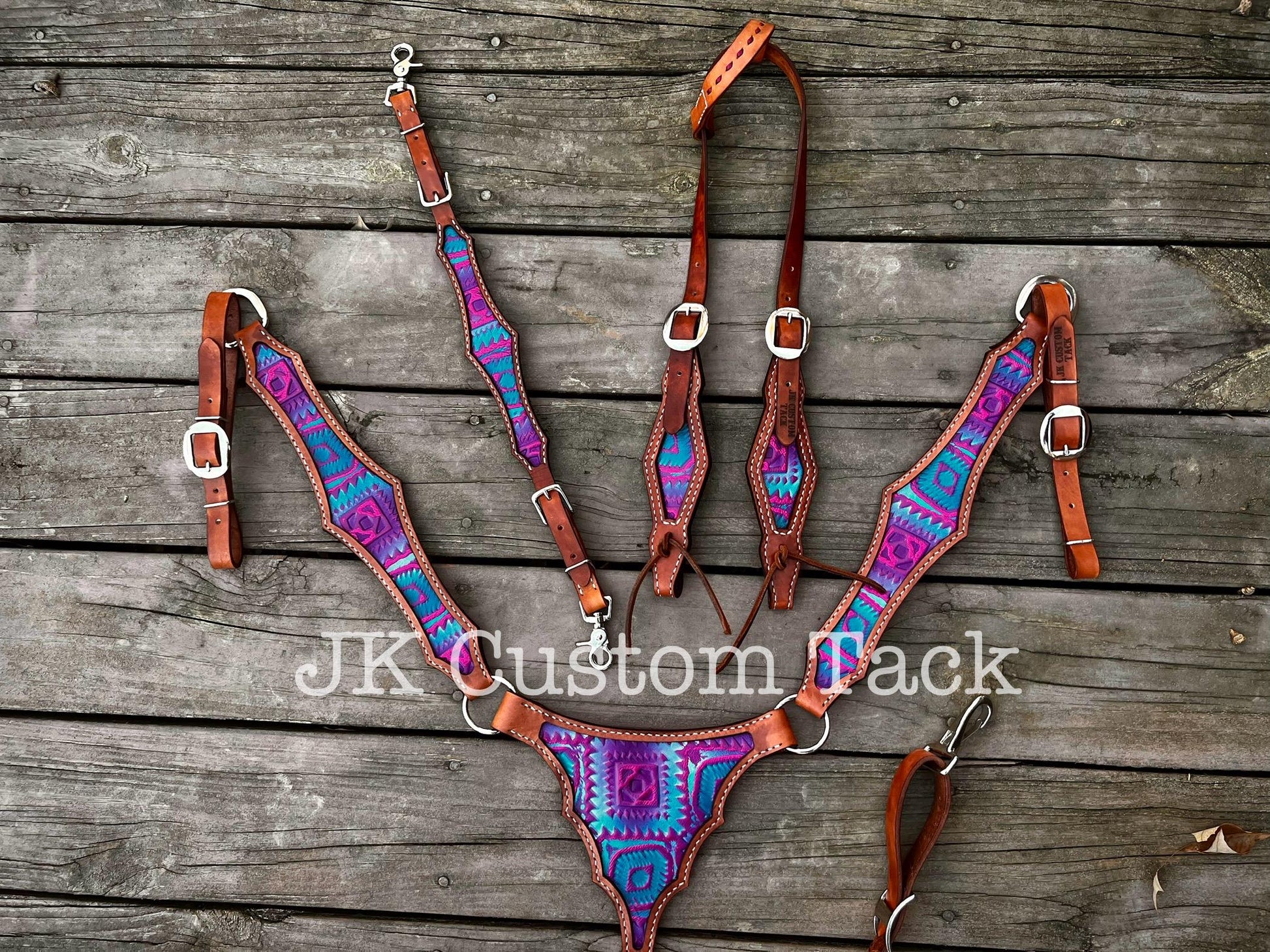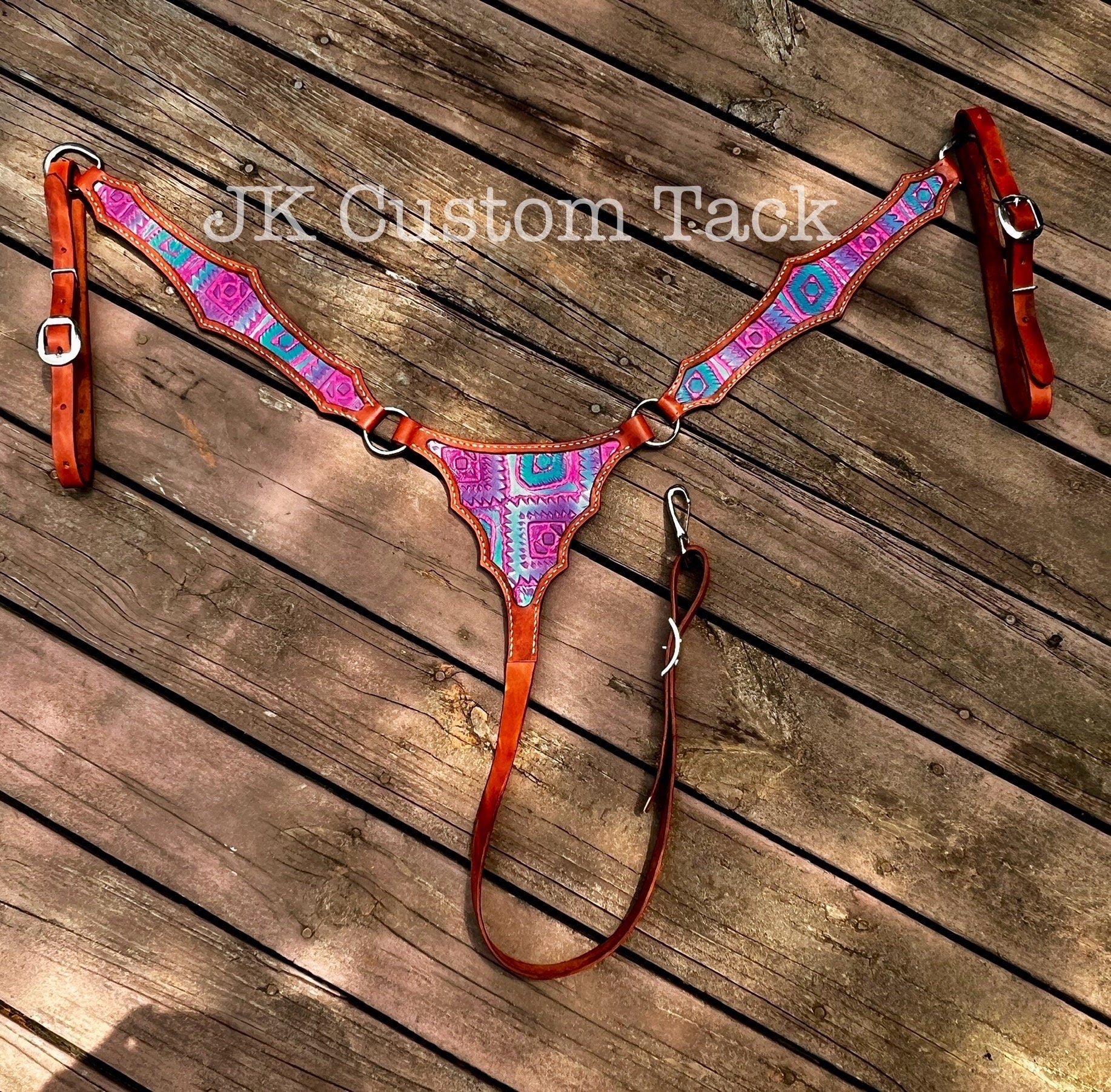 Handcrafted leather breast collar and one eared headstall with Aztec Rio leather inlay and white border stitching. Each stitch is done with heavy duty thread. You can either buy them separate or as a combo. Custom orders are welcome just shoot me a message. Thank you for looking!!