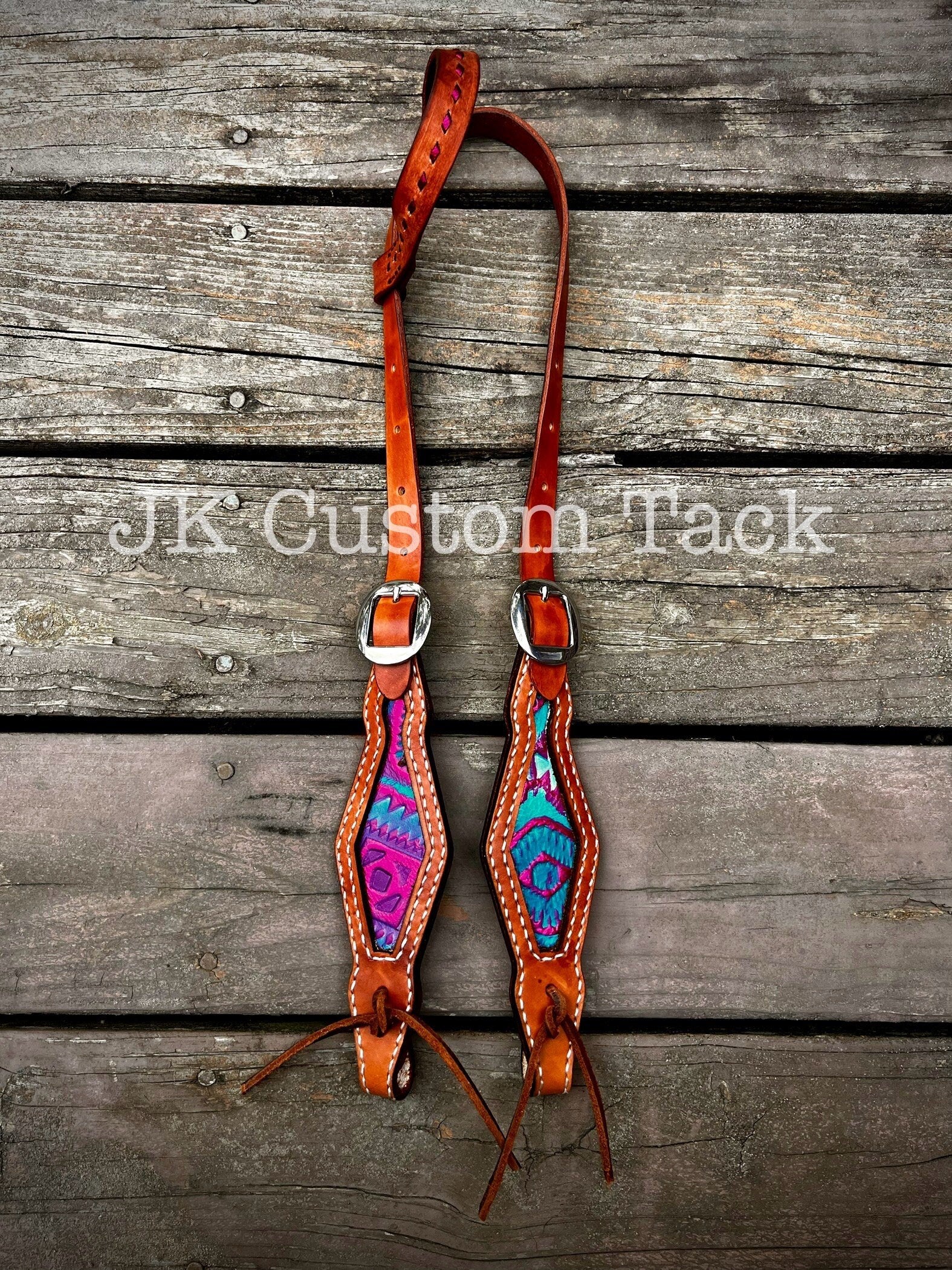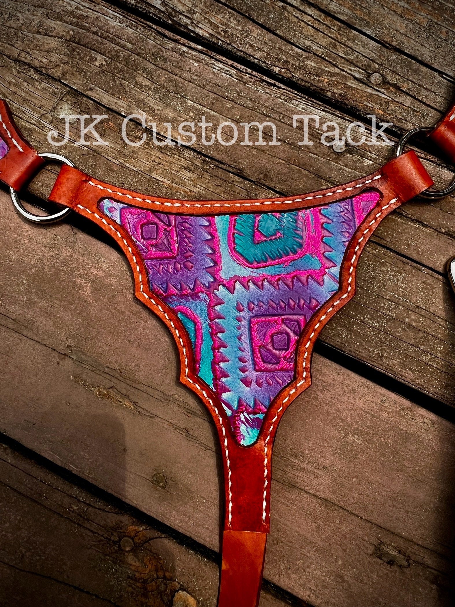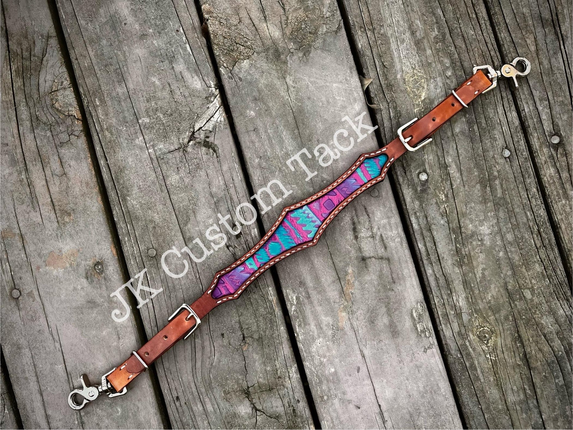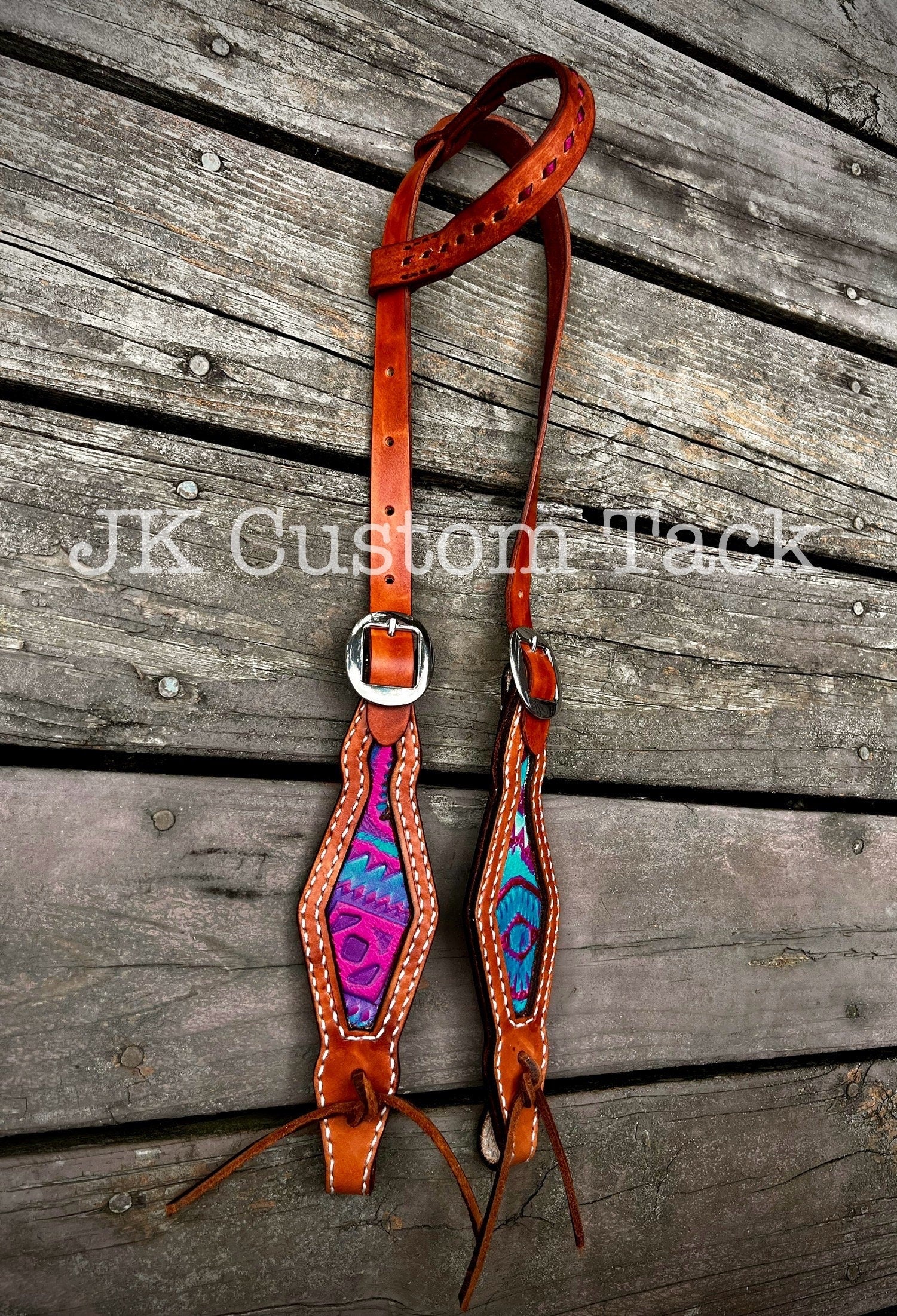 Handcrafted leather breast collar and one eared headstall with Aztec Rio leather inlay and white border stitching. Each stitch is done with heavy duty thread. You can either buy them separate or as a combo. Custom orders are welcome just shoot me a message. Thank you for looking!!