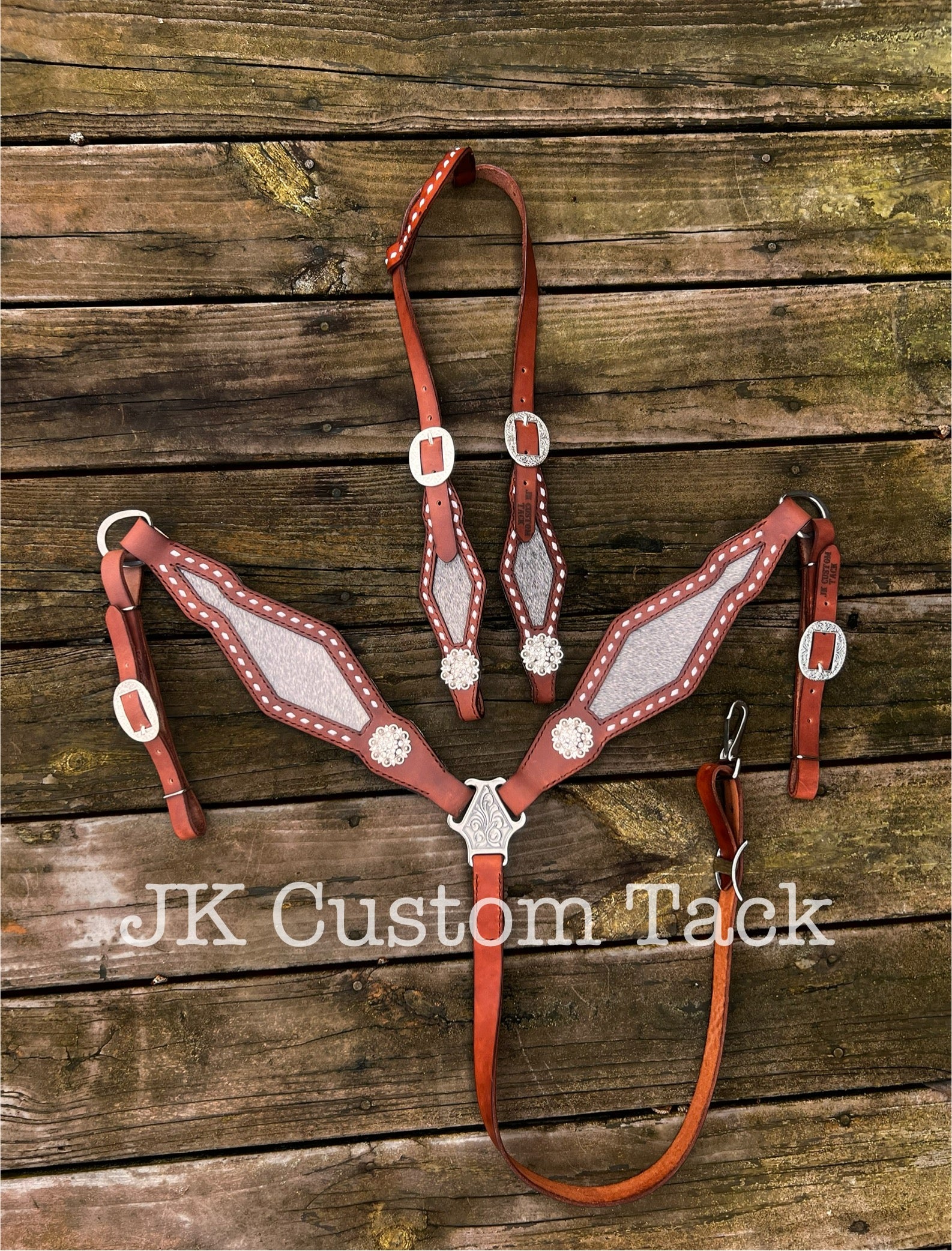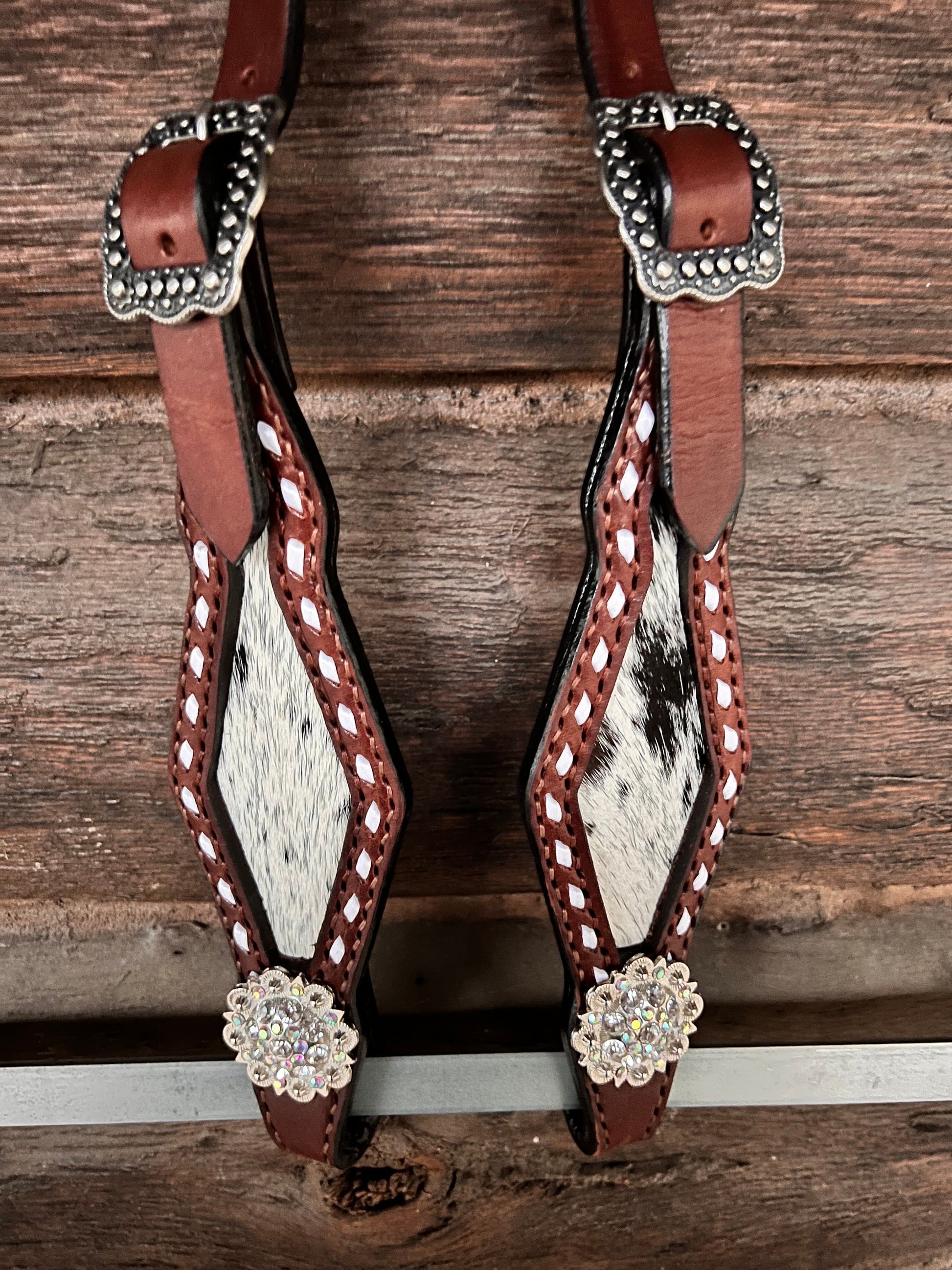 Handcrafted Leather Tack Set with Cowhide Inlay and White Buckstitch
