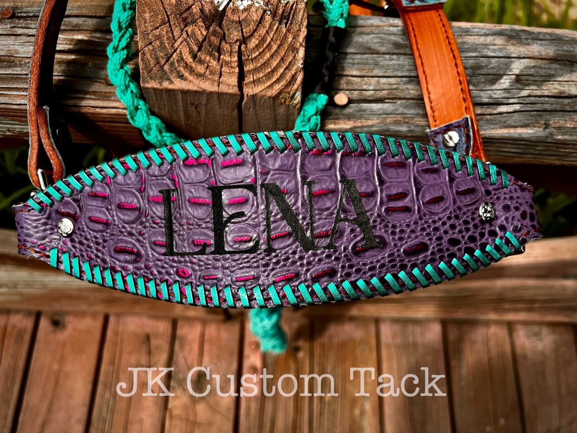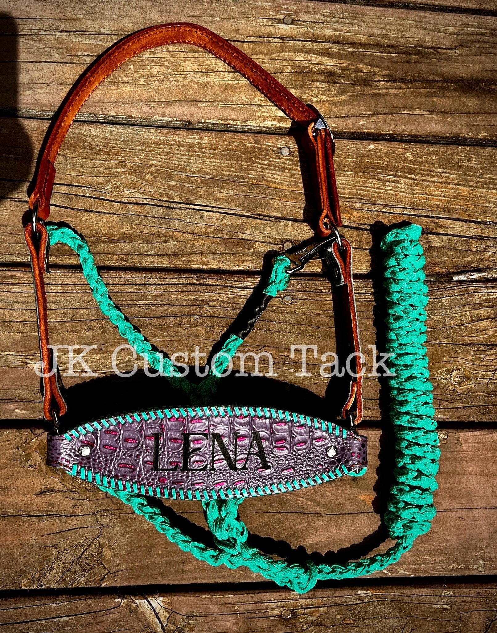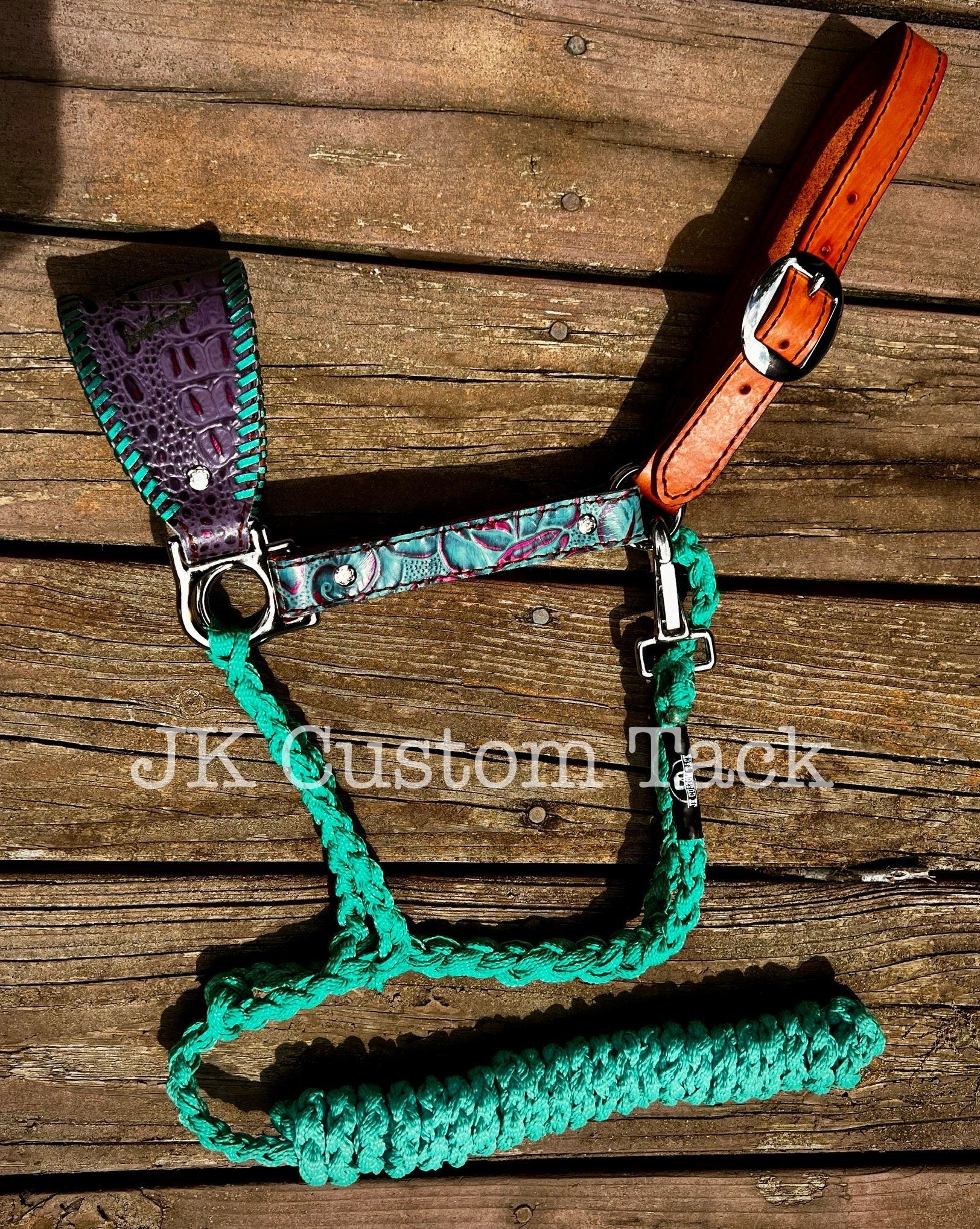 Horse Halter H1 with lead rope. Made with genuine leather and stout mule tape. Easy on/off snap optional. Choose from the many mule tape colors available! These halters are both functional and stylish. Thank y’all!!