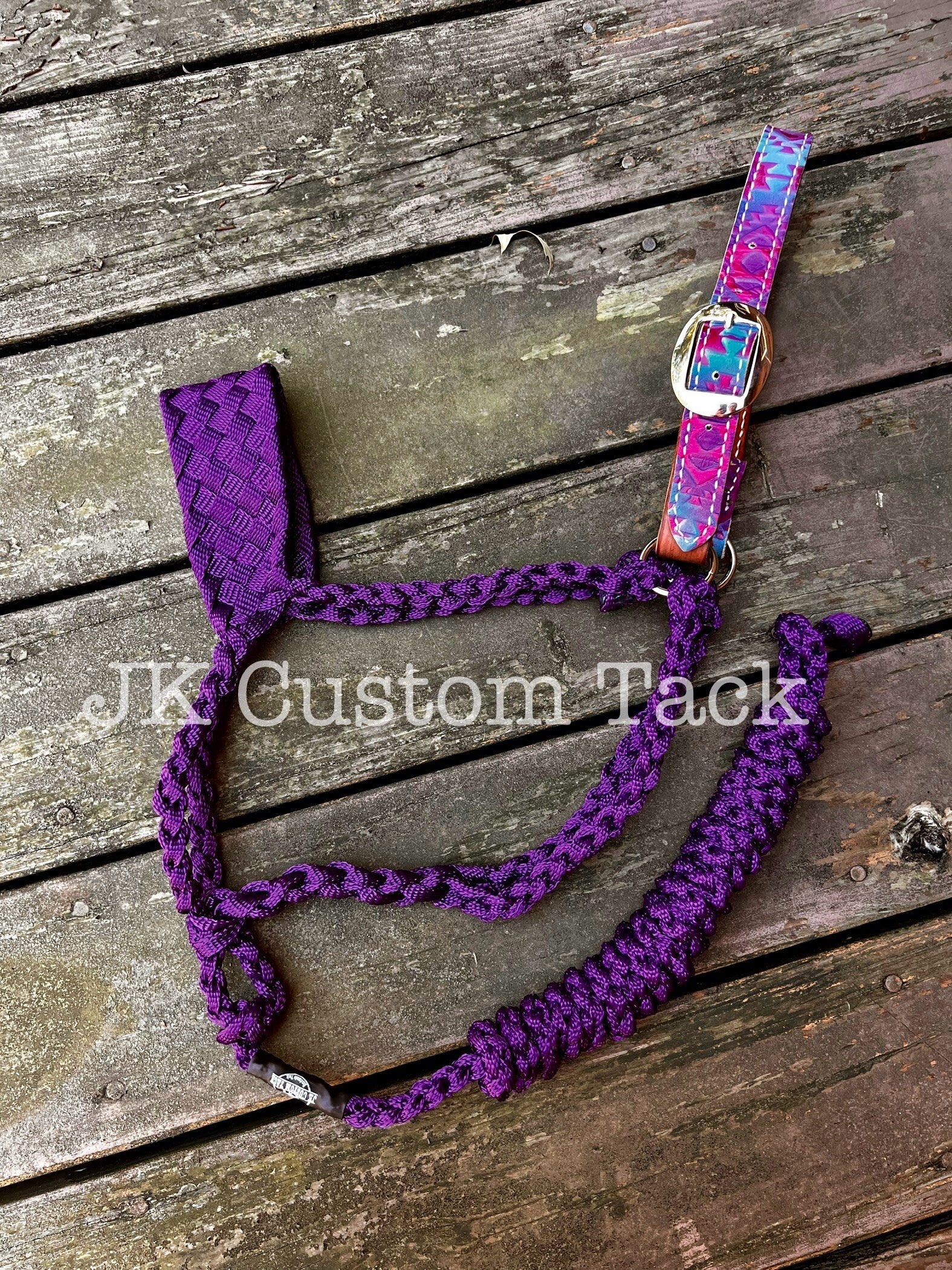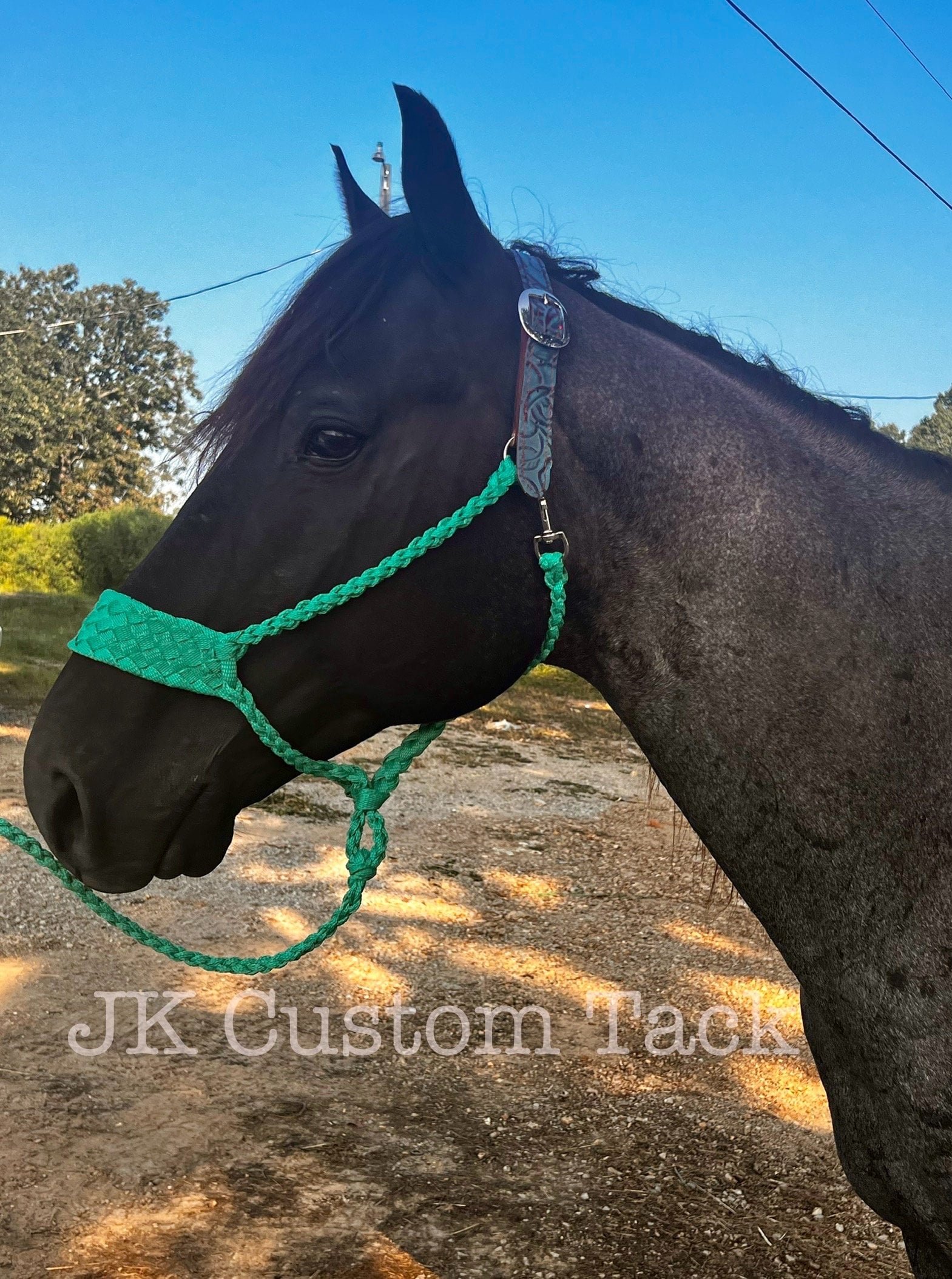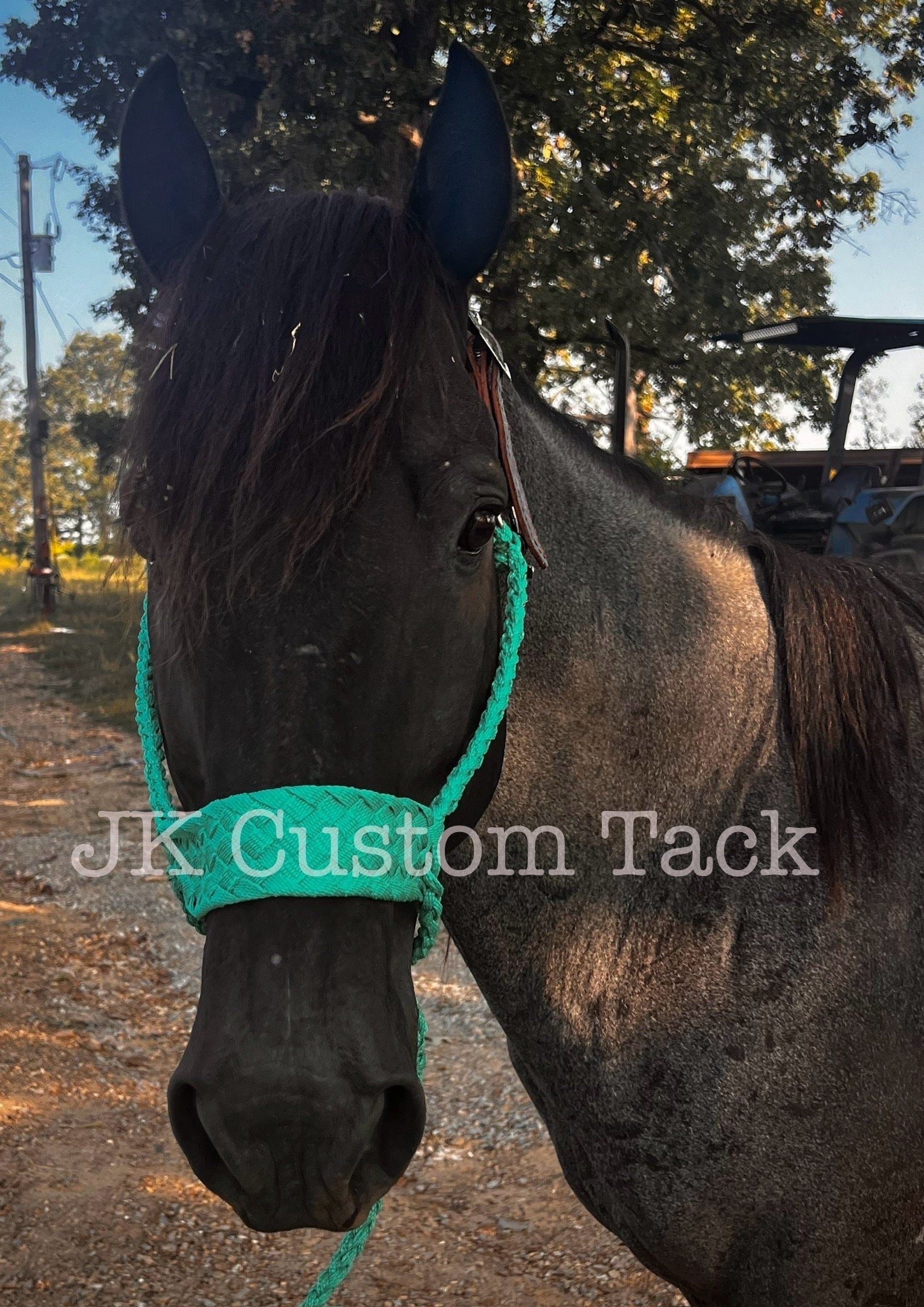 Horse Halter H2. Made with genuine leather and stout mule tape. This halter features a wide mule tape noseband with a leather poll strap overlayed in Aztec Rio. Thank y’all!!