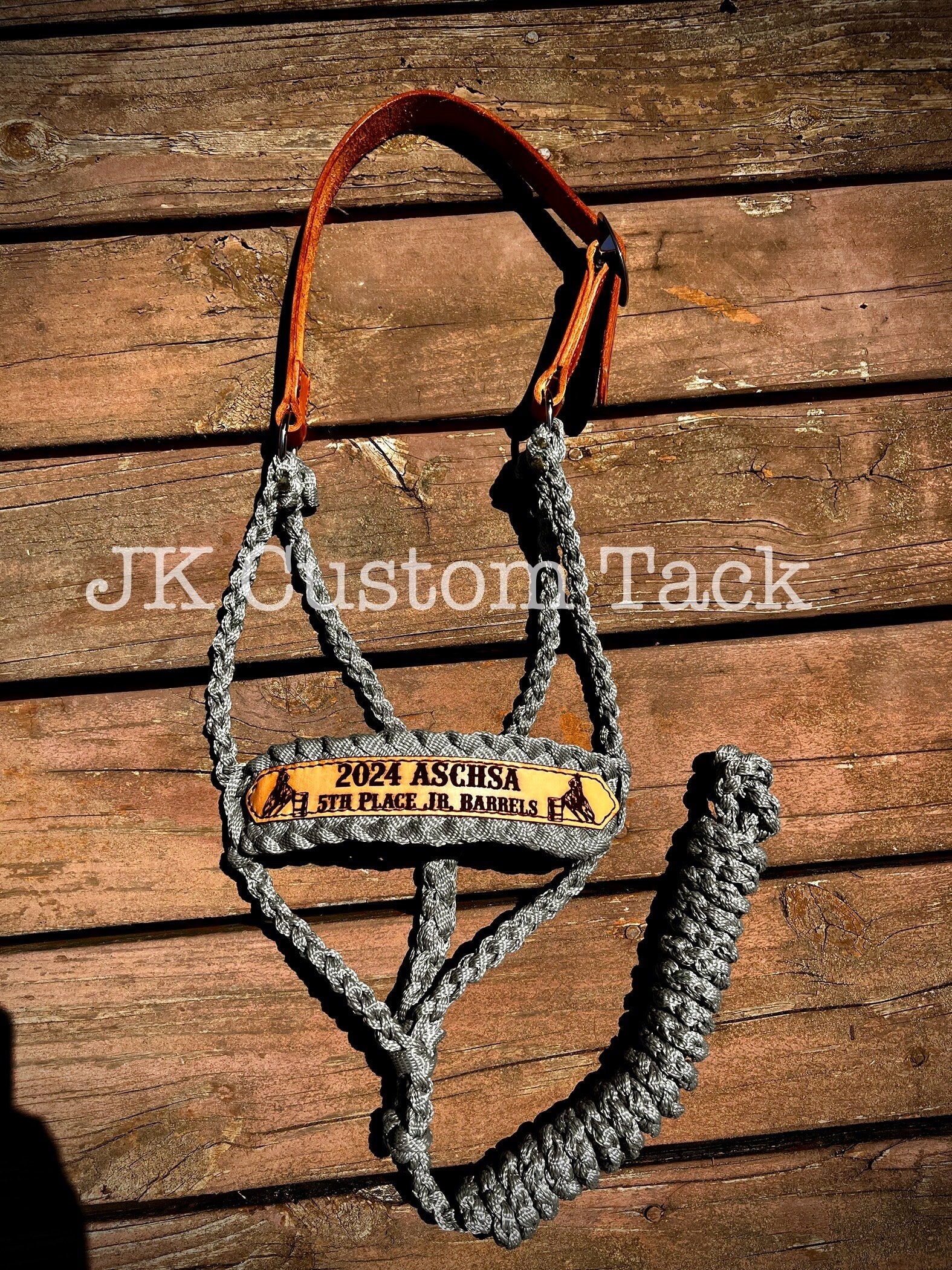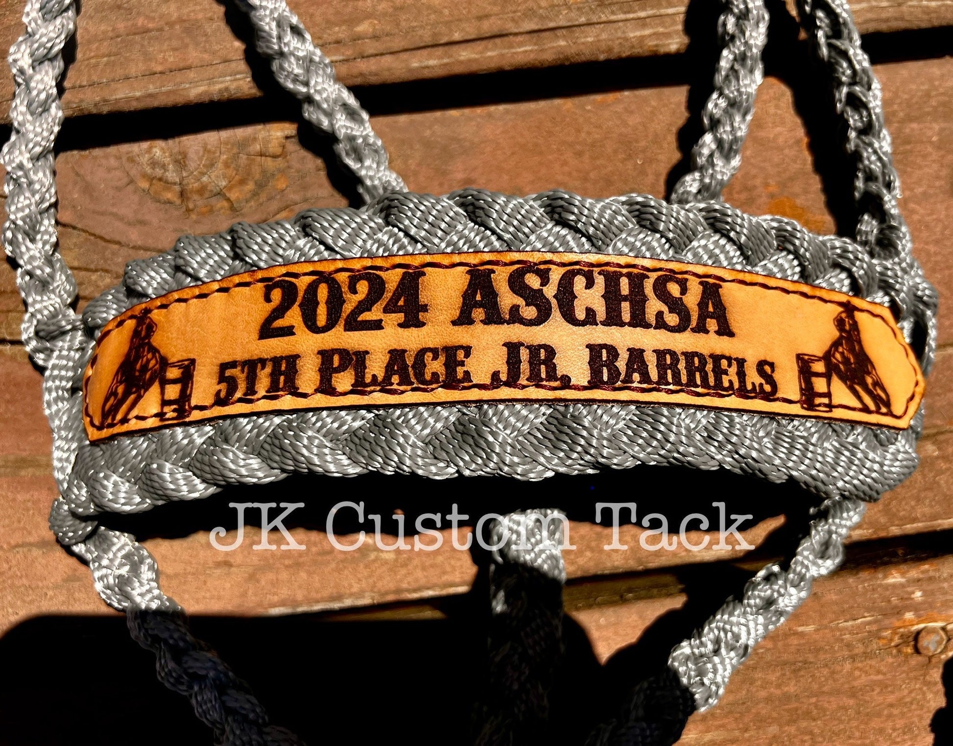 Looking for a unique award for your association? look no further! This Horse Halter H2 comes with a fully customizable leather patch sewn on the noseband. Made with genuine leather and stout mule tape. The H2 halter features a wide mule tape noseband with a leather poll strap. Easy on/off chin strap optional. Thank y’all!!
