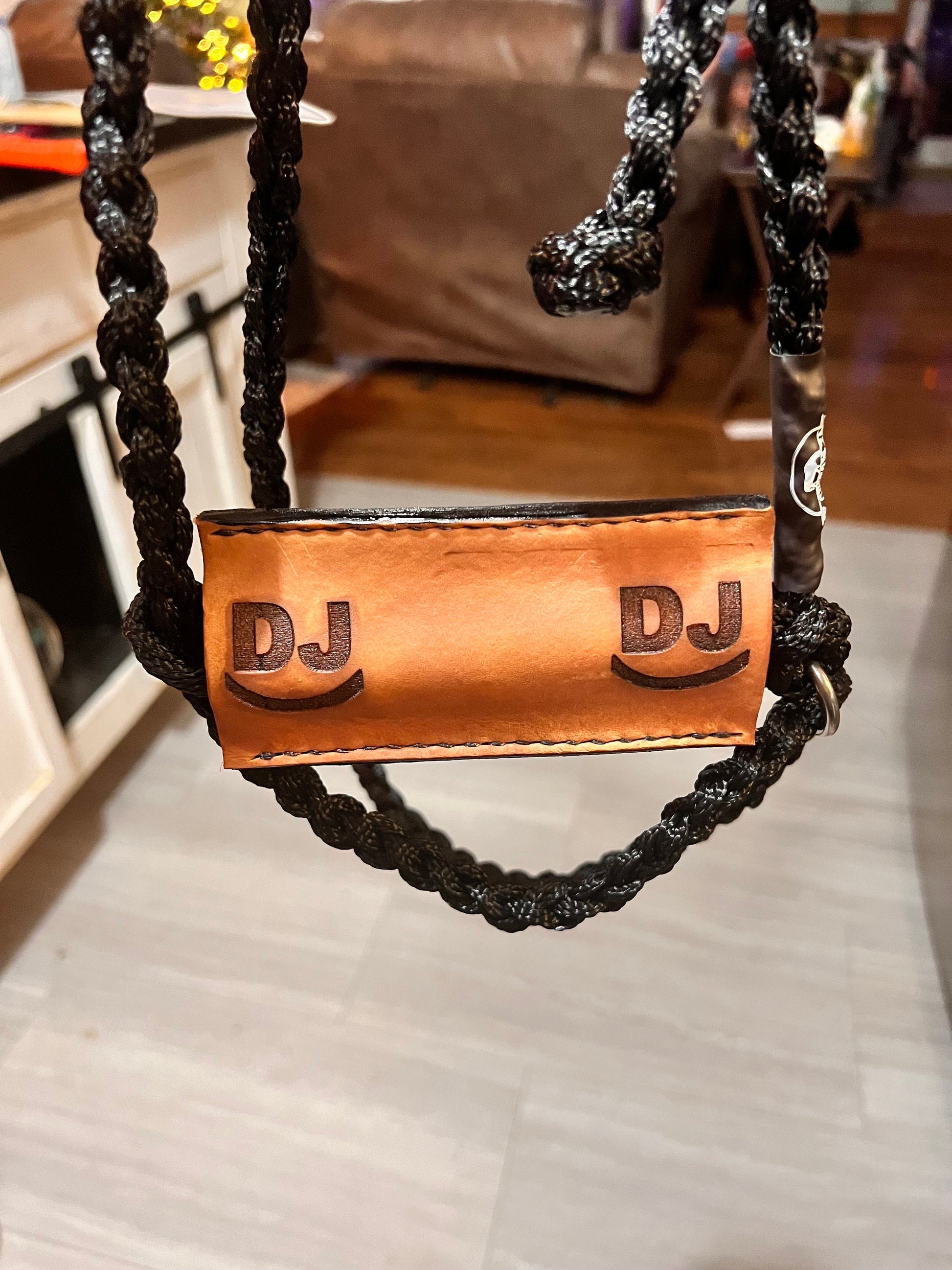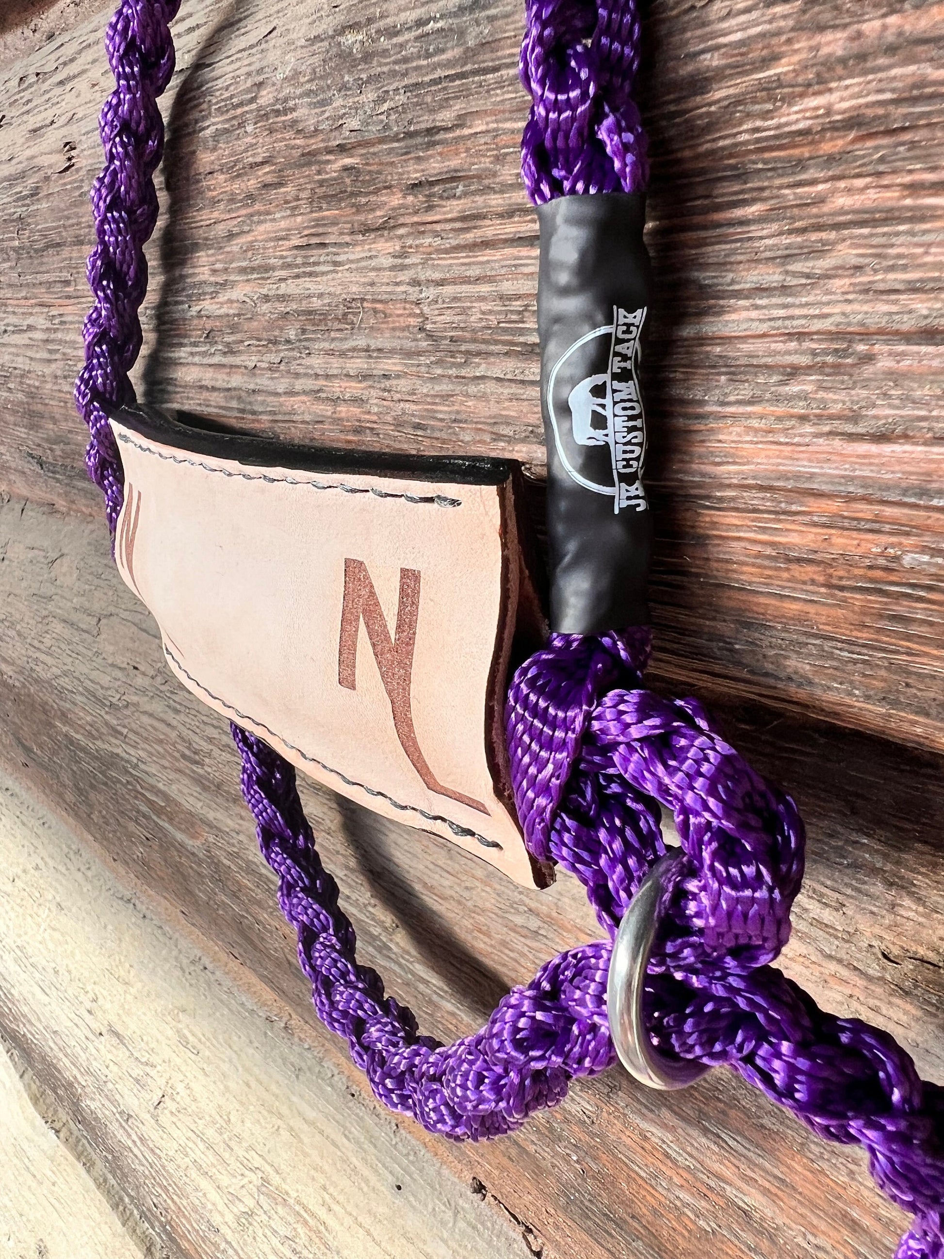 Custom handmade muletape goat/sheep halter with a leather noseband added. Leather can be customized with a lasered logo or name. Two logos max per halter. Stand out in the crowd with these beautiful halters. Comes with lead attached. Choose up to 2 colors. *If you want it engraved you will need to send me a message with a photo attached or description of what you would like.