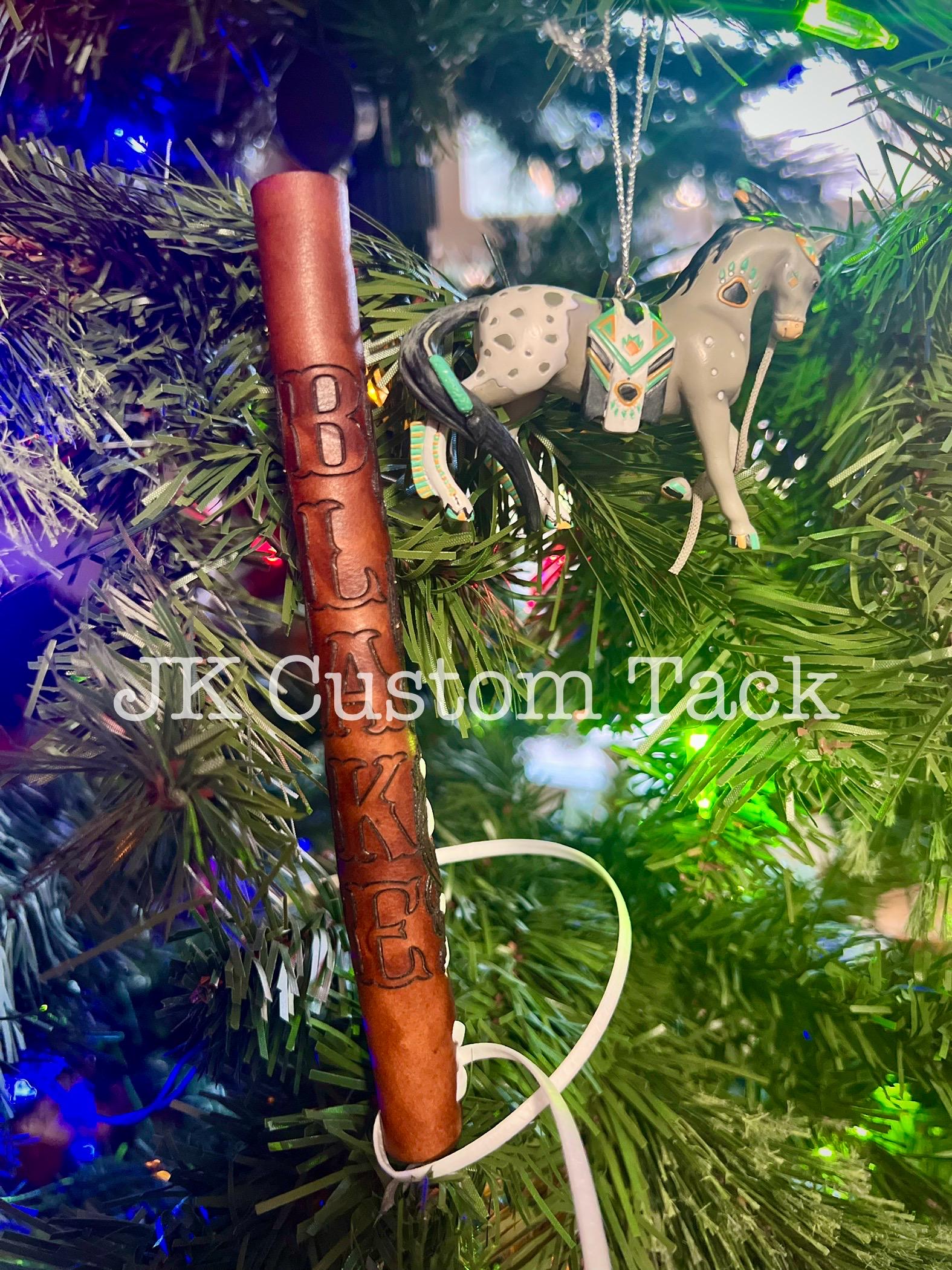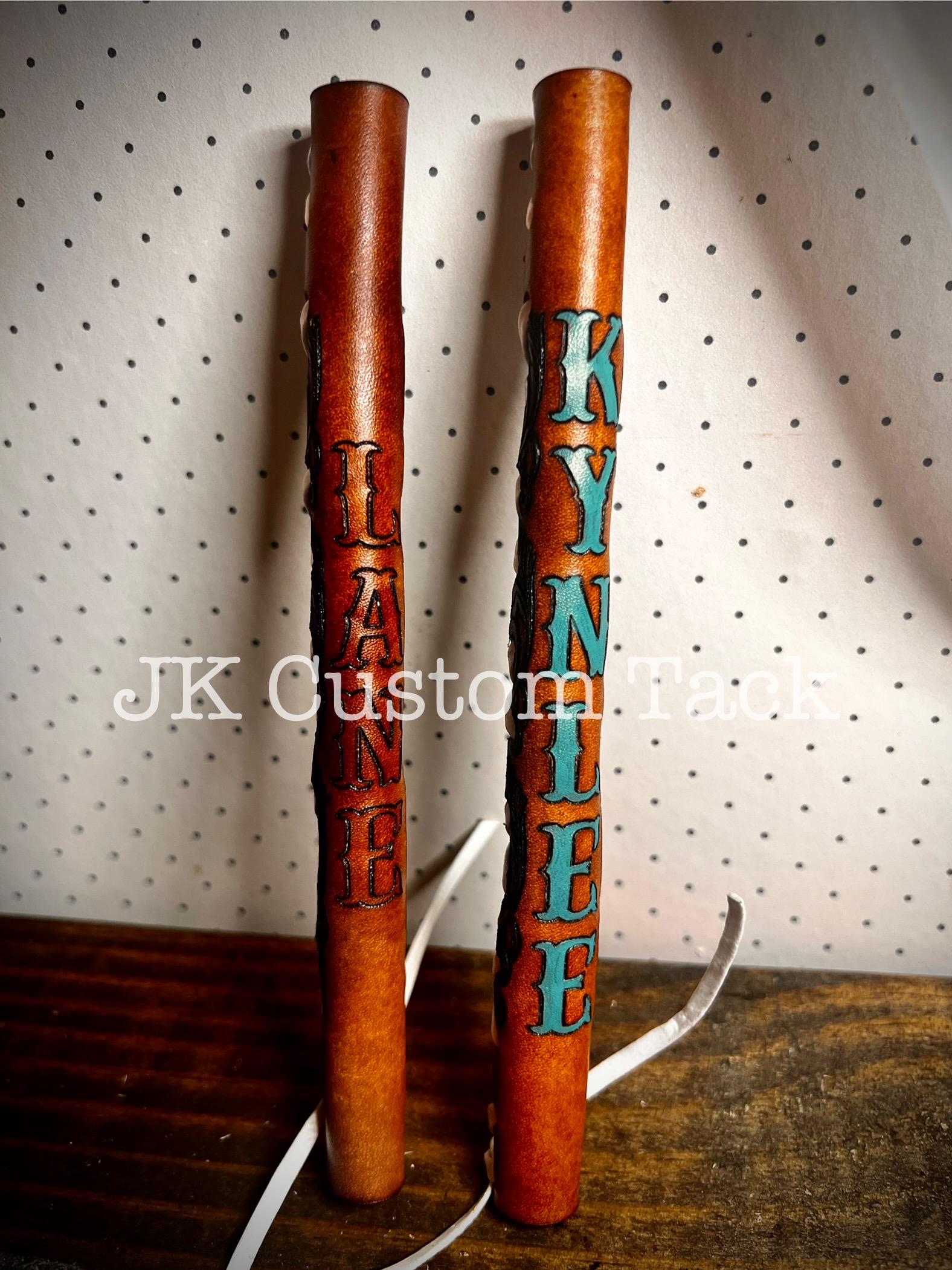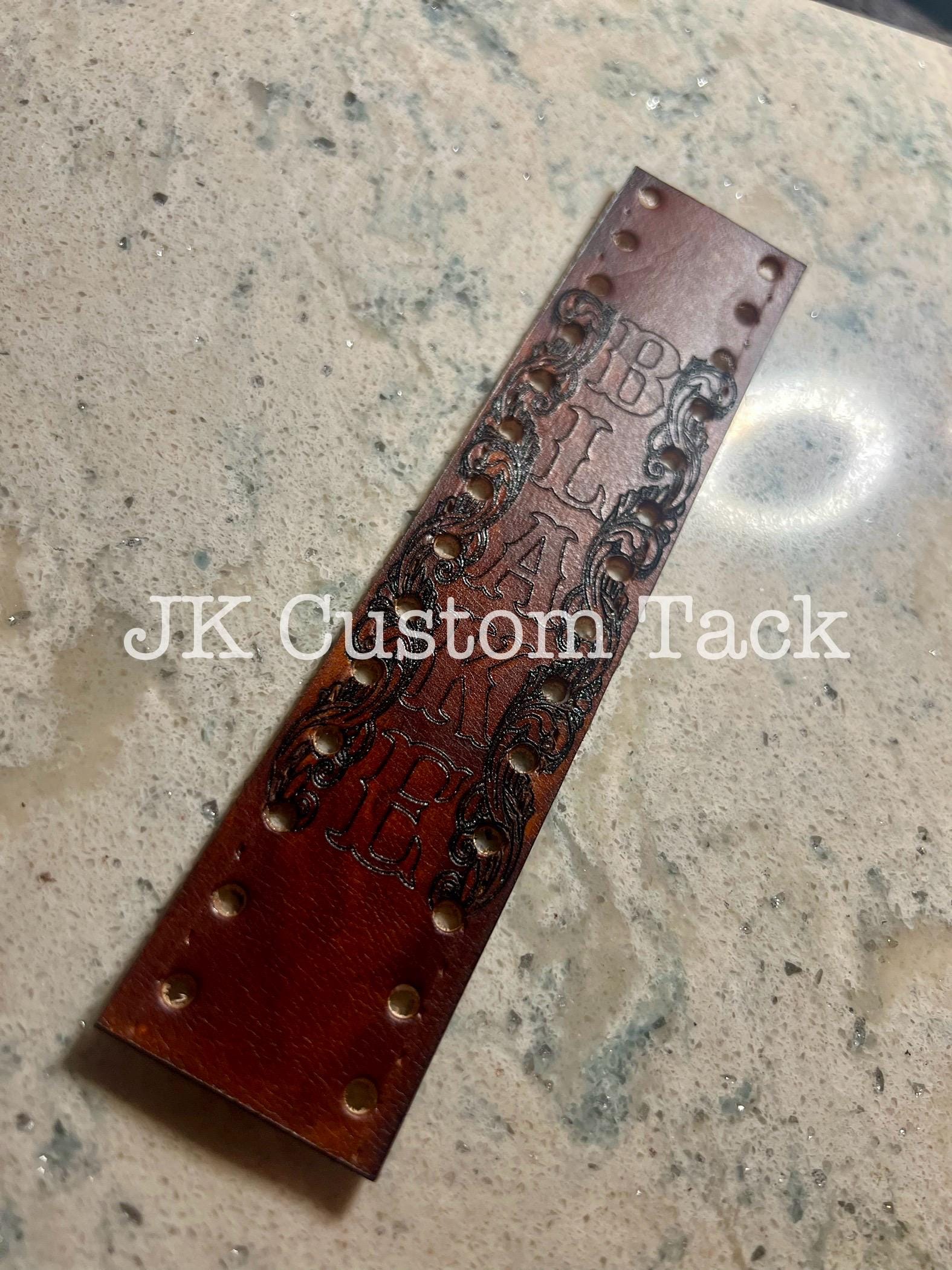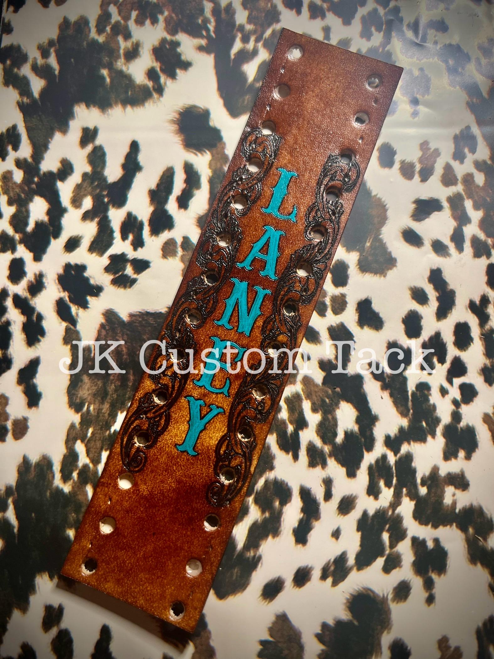 Custom handmade leather pig whip wrap! This is just like my show stick wrap yet smaller to fit those thin pig whips! These can be engraved with a name and the name can be painted if you like. These are made to order only. They are approximately 1.5” wide by 6.5” long. *Due to their size only one name is permitted.